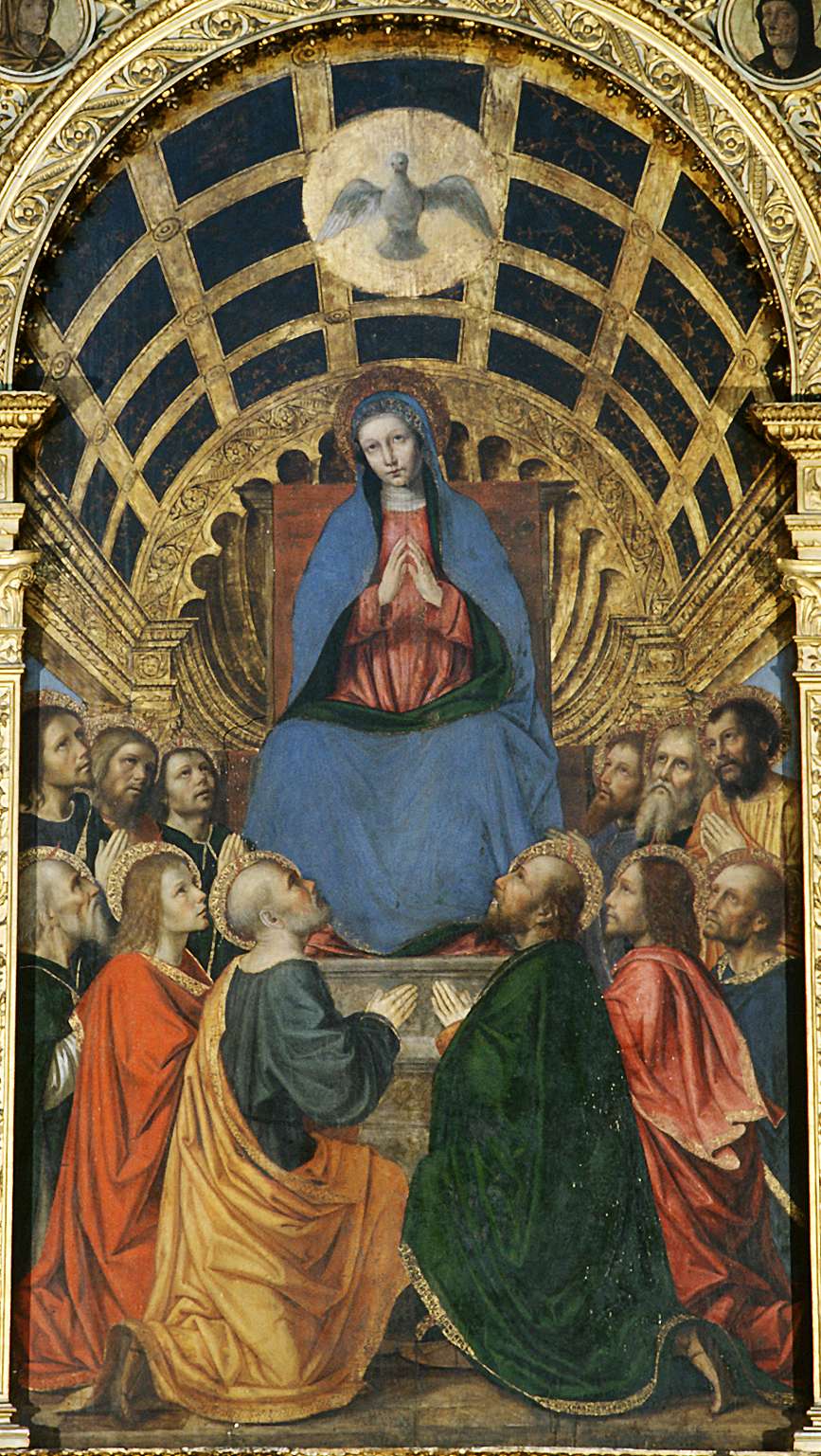 Vangelo Gv 14,15-16.23b-26  Dal Vangelo secondo Giovanni In quel tempo, Gesù disse ai suoi discepoli: «Se mi amate, osserverete i miei comandamenti; e io pregherò il Padre ed egli vi darà un altro Paràclito perché rimanga con voi per sempre. Se uno mi ama, osserverà la mia parola e il Padre mio lo amerà e noi verremo a lui e prenderemo dimora presso di lui. Chi non mi ama, non osserva le mie parole; e la parola che voi ascoltate non è mia, ma del Padre che mi ha mandato. Vi ho detto queste cose mentre sono ancora presso di voi. Ma il Paràclito, lo Spirito Santo che il Padre manderà nel mio nome, lui vi insegnerà ogni cosa e vi ricorderà tutto ciò che io vi ho detto» Tra le opere presenti nella nostra diocesi ispirate da questo brano, è stata scelta la seguente: Dipinto a tempera su tavola: Bergamo, Chiesa di Santo Spirito
